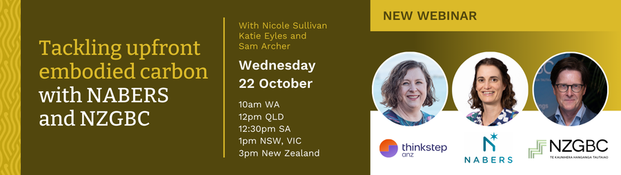 NEW: Tackling upfront embodied carbon with NABERS and NZGBC Online | 22 October 2025 | 3:00pm Reducing a building’s emissions starts long before the foundation is laid. With strong progress already made in reducing operational energy, upfront embodied carbon - from materials, transport and construction - is now emerging as the largest share of a building’s footprint. Join us for a webinar with Katie Eyles, Embodied Carbon Lead at NABERS, Sam Archer, Director of Market Transformation at the New Zealand Green Building Council (NZGBC), and Nicole Sullivan, Impact Director at thinkstep-anz. Together, they’ll discuss where the industry stands and how the NABERS tool can help drive progress. | |